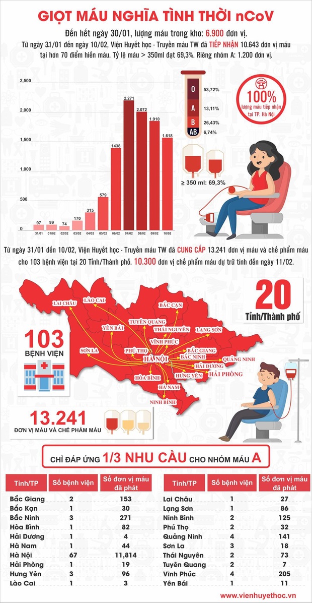 “Đến sáng 11/2/2020, lượng máu dự trữ của Viện là hơn 10.000 đơn vị máu, trong đó nhóm A là 1.200 đơn vị. Tuy nhiên, do nhu cầu sử dụng máu rất cao và bị thiếu hụt trong gần 3 tuần nên vẫn rất cần sự nối chung tay của các cơ quan, đơn vị và cộng đồng với người bệnh trong những ngày tiếp theo”
